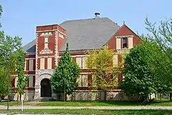 The building was designed in the Richardsonian Romanesque style. The exterior, which was composed of red brick and Anamosa Limestone and Bedford limestone, featured simple and bold massing. A flared and rusticated limestone base reinforced the visual weightiness of the building. A bell tower was constructed in brick on the front of the building and was removed in the 1940s.[2] It featured stone quoining. A recessed entry was located below an archway that featured wrought-iron scrollwork.