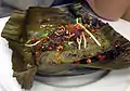 Nga baung thoke ငါးပေါင်းသုပ် Mon Mixed vegetables and prawn, wrapped in morinda leaves and banana leaves outside.