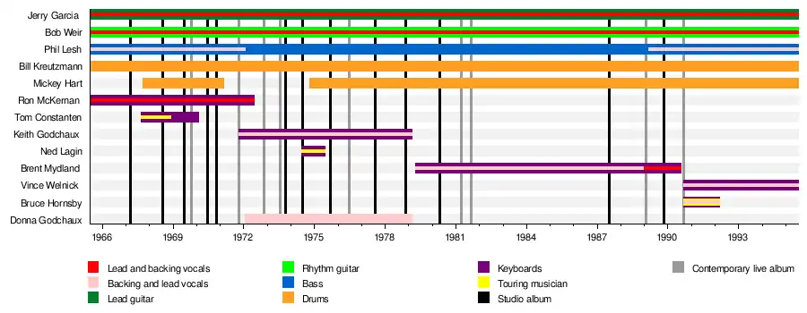 Over a span of 30 years the Grateful Dead had various combinations of members, as shown in the table.[1]