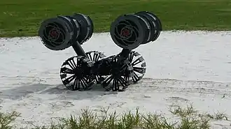ATHLETE (All-Terrain Hex-Legged Extra-Terrestrial Explorer) is a six-limbed robotic lunar rover test-bed that is being developed in the Jet Propulsion Laboratory (JPL) at California Institute of Technology. ATHLETE is a test bed for various systems that could be used for lunar or Martian exploration. Each of the ATHLETE's six limbs have six degrees of freedom meaning they have six independently operated joints. For general traveling purposes the ATHLETE rolls on its six wheels but if it encounters more rugged and extreme terrain, it is able to lock each wheel into place and walk using its limbs. The first generation ATHLETE was developed in 2005 and consisted of 6, six-degree-of-freedom limbs mounted to the frame of the robot. With a standing height of 2 m (6.5 ft) and a hexagonal frame of 2.75 m (9 ft), the ATHLETE weighs about 850 kg (1875 lb) and can carry a load of up to 300 kg (660 lb). only two were ever constructed in 2005 and one is still operational today.