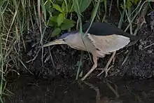 Nightjars are medium-sized nocturnal birds that usually nest on the ground. They have long wings, short legs and very short bills. Most have small feet, of little use for walking, and long pointed wings. Their soft plumage is camouflaged to resemble bark or leaves.