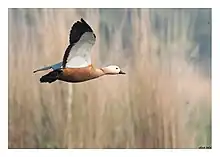 Bustards are large terrestrial birds mainly associated with dry open country and steppes in the Old World. They are omnivorous and nest on the ground. They walk steadily on strong legs and big toes, pecking for food as they go. They have long broad wings with "fingered" wingtips and striking patterns in flight. Many have interesting mating displays.