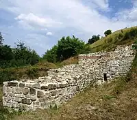 | Kovachevsko kale castrum | ![]() | Kovachevsko kale is a late Roman fortress, whose ruins are located 6 km west of the town of Popovo, near the modern road Popovo - Byala. The ancient name of the settlement is unknown. The Czech archaeologist Karel Škorpil called it Kovachoveshko kale, after the name of the nearby village, Kovachevets. The fortress is located on a flat terrain, naturally protected by low-water rivers. It has a roughly triangular form. The defensive stone walls are fortified with 17 U-shaped towers. There are two gates, one to the west, to other one to the north-east. | ![]() |