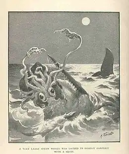 Tales of giant squid have been common among mariners since ancient times, but the animals were long considered mythical and often associated with the kraken of Nordic legend.[4] The giant squid did not gain widespread scientific acceptance until specimens became available to zoologists in the second half of the 19th century, beginning with the formal naming of Architeuthis dux by Japetus Steenstrup in 1857, from fragmentary Bahamian material collected two years earlier (#14 on this list).[5][nb 2] In the same work, Steenstrup also named a second species, Architeuthis monachus, based on a preserved beak, the only part saved from a carcass that washed ashore in Denmark in 1853 (#13).[19] The giant squid came to public prominence in 1861 when the French corvette Alecton encountered a live animal (#18) at the surface while navigating near Tenerife. A report of the incident filed by the ship's captain[20] was almost certainly seen by Jules Verne and adapted by him for the description of the monstrous squid in Twenty Thousand Leagues Under the Sea.[3]