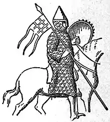 Ralph I, Count of Vermandois: A gonfanon is found on an equestrian seal dated to 1135 that depicts a chequy pattern, though the shield face is not visible in the seal and so there is no evidence that Ralph himself bore arms. This seal is of note only because the direct descendants of Ralph I would later adopt for arms, Chequy Or and azure; the descendants of his nephew Waleran de Beaumont, 1st Earl of Worcester would adopt, Chequy Or and gules. | |