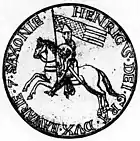 In some cases, the adoption of a symbol on a coat of arms was the culmination of a gradual progression, whereby a family can be seen using a symbol in a quasi-heraldic manner prior to its adoption as part of a formal coat. An example of this are the Counts of Saint-Pol, who between 1083 and 1130 decorated their coins with wheat sheafs that are then found on the equestrian seal of Count Engueraud (1141–50) placed in the blank space surrounding the mounted knight, before appearing on the shield of count Anselm and his successors from 1162. Similarly, the fleur-de-lis progressed from use as a decorative emblem by Henry I of France (1031–60) to then be displayed as a quasi-heraldic symbol by Louis VI, Louis VII, and Philip II (1180-1223) before becoming the charge of the French royal arms under the last of these kings.[4] Lions were used as heraldic emblems by Henry "the Lion" (before 1146), and Alfonso VII of León (d. 1157),[5] and probably by Henry I of England (d. 1135),[6] in the first half of the 12th century, and lions later appear on the coats of arms of their respective realms.