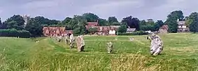 The larger circle, named the “Manza” circle has a diameter of 46 meters, and is the largest stone circle found in Japan. A number of reconstructions of Jomon period dwellings have been built around the site. The slightly smaller circle, named the “Nonakado” circle, is 42 meters in diameter and is located around 90 meters away, separated from the “Manza” circle by Akita Prefectural Route 66. Each circle is made from rounded river stones brought from another river approximately 7 kilometers away. Each circle in concentric, with and inner and an outer ring separated by an open strip approximately 8 meters wide.[16] Each circle contains smaller clusters of stone, including standing stones surrounded by elongated stones in a radiating orientation, forming a sundial which points toward the sunset on the summer solstice and allows for calculation of the winter solstice, the vernal equinox and the sun's movements.[17]
