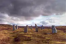 Aubrey Burl's gazetteer lists seven sites in Shetland, but notes that all are dubious.[13] The Royal Commission on the Ancient and Historical Monuments of Scotland records three stone circles.[14] It does not include Hjaltadans, which is instead categorised as a 'stone setting'.[15]