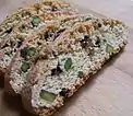 ZwiebackA type of crisp, sweetened bread, made with eggs and baked twice. It is sliced before it is baked a second time, which produces crisp, brittle slices that closely resemble melba toast.[17] The name comes from German zwei ("two") or zwie ("twi-"), and backen, meaning "to bake".[18] Zwieback hence literally translates to "twice-baked". Zwieback is commonly used to feed teething children.[17]
