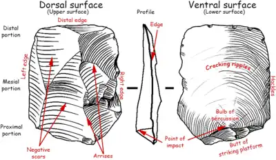 In archaeology, a lithic flake is a "portion of rock removed from an objective piece by percussion or pressure,"[1]: 255 and may also be referred to as simply a flake, or collectively as debitage. The objective piece, or the rock being reduced by the removal of flakes, is known as a core.[1]: 254, 258 Once the proper tool stone has been selected, a percussor or pressure flaker (e.g., an antler tine) is used to direct a sharp blow, or apply sufficient force, respectively, to the surface of the stone, often on the edge of the piece. The energy of this blow propagates through the material, often (but not always) producing a Hertzian cone of force which causes the rock to fracture in a controllable fashion. Since cores are often struck on an edge with a suitable angle (<90°) for flake propagation, the result is that only a portion of the Hertzian cone is created. The process continues as the flintknapper detaches the desired number of flakes from the core, which is marked with the negative scars of these removals. The surface area of the core which received the blows necessary for detaching the flakes is referred to as the striking platform.