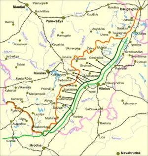 Red Army captured one town after another: Zarasai and Švenčionys (Dec. 22), Utena (Dec. 23), Rokiškis and Vilnius[33] (Jan. 5), Ukmergė and Panevėžys (Jan. 9), Šiauliai (Jan. 15), Telšiai (Jan. 25).[30] That accounted for about 2⁄3 of the Lithuanian territory. The front somewhat stabilized when Soviet forces were stopped near the Venta River by Latvian and German units (Baltische Landeswehr).[34] Also, Germans slowed down the withdrawal of their troops after the Spartacist uprising was subdued on January 12.[35] Southern Lithuania was a little better protected as Germans retreated from Ukraine through Gardinas. To prevent fights between retreating Germans and the Red Army, the Soviets and Germans signed a treaty on January 18. The treaty drew a temporary demarcation line that went through Daugai, Stakliškės, and 10 kilometres (6.2 mi) east of the Kaišiadorys–Jonava–Kėdainiai railway.[36] That barred Bolshevik forces from directly attacking Kaunas, Lithuania's second-largest city. The Red Army would need to encircle Kaunas and attack through Alytus or Kėdainiai. The operation to take Kaunas began on February 7.