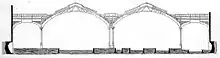 The main station was extended about 230 ft (70 m) eastwards; additional shops and offices were constructed east of the new train shed up to the parish boundary with Bishopsgate-Street Without.[31] A new roof was built over the new construction.[32][33] The outer wall was constructed with Staffordshire blue brick and Ruabon bricks.[34] The four train shed roofs were carried out by Messrs. Handyside and Co., supervised by a Mr Sherlock, the resident engineer; all the foundations, earthwork and brickwork were carried out by Mowlem & Co. Electric power (for lighting) was supplied from an engine house north of the station.[35] Additional civil works included three iron bridges carrying road traffic over the railway on Skinner, Primrose and Worship Streets.[36] The bridge ironwork was supplied and erected by the Horseley Company.[37][38][39] John Wilson was chief engineer, with W. N. Ashbee as architect.[24] As part of the works, the GER was obliged by Parliament to rehouse all tenants displaced by the works, with 137 put into existing property and the remaining 600 into tenements constructed at the company's expense.[40]