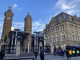 During the war, the station's structure sustained damage from a nearby bomb, particularly the Gothic tower at the main entrance on Liverpool Street and its glass roof.[61]
