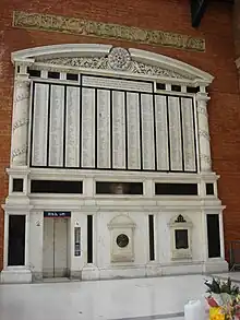 Over 1,000 GER employees who died during the war were honoured on a large marble memorial installed in the booking hall, unveiled on 22 June 1922 by Sir Henry Wilson. On his return home from the unveiling ceremony, Wilson was assassinated by two Irish Republican Army members. He was commemorated by a memorial plaque adjoining the GER monument, unveiled one month after his death.[47][48] The GER memorial was relocated during the modification of the station and now incorporates both the Wilson and Fryatt memorials, as well as a number of railway related architectural elements salvaged from demolished buildings.[27]