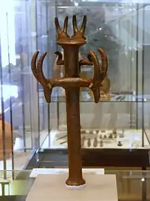 Some Late Bronze Age sites in Cyprus have produced cast bronze figures of humans and animals. One example is the male figure found at Enkomi. Three objects from Cyprus (held in the Metropolitan Museum of Art in New York) were cast by the lost-wax technique from the 13th and 12th centuries BC, namely, the amphorae rim, the rod tripod, and the cast tripod.[31]