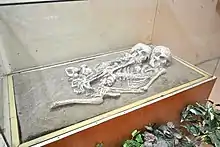 The people of Lothal worshipped a fire god who is speculated to be the horned deity depicted on seals. The presence of private and public fire-altars where religious ceremonies were hosted further testifies to their spiritual beliefs. Archaeologists have discovered gold pendants, charred ashes of terra-cotta cakes and pottery, bovine remains, beads and other signs that may indicate the practice of the Gavamayana sacrifice, associated with the ancient Vedic religion.[28] Animal worship is also evidenced, but not the worship of the Mother Goddess that is evidenced in other Harappan cities—experts consider this a sign of the existence of diversity in religious traditions. However, it is believed that a sea goddess, perhaps cognate with the general Indus-era Mother Goddess, was worshipped. Today, the local villagers likewise worship a sea goddess, Vanuvati Sikotarimata, suggesting a connection with the ancient port's traditions and historical past as an access to the sea.[29][30] But the archaeologists also discovered that the practice had been given up by 2000 BCE (determined by the difference in burial times of the carbon-dated remains). It is suggested that the practice occurred only on occasion. It is also considered that given the small number of graves discovered—only 17 in an estimated population of 15,000—the citizens of Lothal also practised cremation of the dead. Post-cremation burials have been noted in other Indus sites like Harappa, Mehi and Damb-Bhuti.[31]