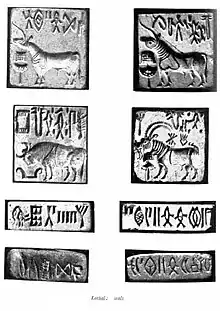 The discovery of etched carnelian beads and non-etched barrel beads in Kish and Ur (modern Iraq), Jalalabad (Afghanistan) and Susa (Iran) attest to the popularity of the Indus bead industry across West Asia.[36] The lapidaries select stones of variegated colours, producing beads of different shapes and sizes. The methods of Lothal bead-makers were so advanced that no improvements have been noted over 4,000 years—modern makers in the Khambhat area follow the same technique. Double-eye beads of agate and collared or gold-capped beads of jasper and carnelian beads are among those attributed as uniquely from Lothal. It was very famous for micro-cylindrical beads of steatite (chlorite).[35] The Lothal excavation yielded 213 seals, third in volume amongst all Indus sites. Seal-cutters preferred short-horned bulls, mountain goats, tigers and composite animals like the elephant-bull for engravings. There is a short inscription of intaglio in almost every seal. Stamp seals with inserted copper rings in a perforated button were used to seal the cargo with impressions of packing materials like mats, twisted cloth, and cords. These seals were only verified at Lothal. Quantitative descriptions along with seals of rulers and owners were stamped on goods. A unique seal found here is from Bahrain—circular, with motif of a dragon flanked by jumping gazelles.[37]