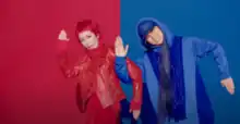 A scene in the "Magnetic" music video showing Kimura (left) and Ai (right) linking arms, similar to how magnets of opposite poles can connect to one another.