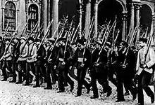 When the Ukrainian nationalists in Huliaipole began threatening anarchists with reprisals, local anarcho-syndicalists initiated a campaign of "revolutionary terror" against them, assassinating one nationalist leader before being forced to the negotiating table by Nestor Makhno.[42] The nationalists subsequently began planning a coup, threatening pogroms against the local Jewish community in order to bring them on side.[43] On the night of 15–16 April, the Ukrainian nationalists carried out the coup, launching a surprise attack against the anarchist "free battalion" and disarming them, before arresting leading anarcho-communists.[44] The following day, a demonstration managed to secure the release of the arrested anarchists but were unable to organize any armed defense of the town, which was soon occupied by the Austro-Hungarian Army.[45] Before the end of the month, the Ukrainian People's Republic was overthrown by the Central Powers and replaced with the Ukrainian State. Under the rule of Pavlo Skoropadskyi, the new regime began returning land to the nobility and requisitioning grain from the peasantry, which fomented popular discontent that ignited the Ukrainian War of Independence.[46]