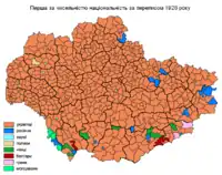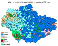 Map of the most common native languages in the districts and cities of the Ukrainian SSR, developed by the Soviet Census of December 1926.