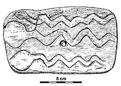An ivory plaque (front and back) with circular marks, and three snakes[16]