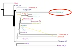 Mal'ta Ancient North Eurasian population within a maximum-likelihood phylogenetic tree.[32]