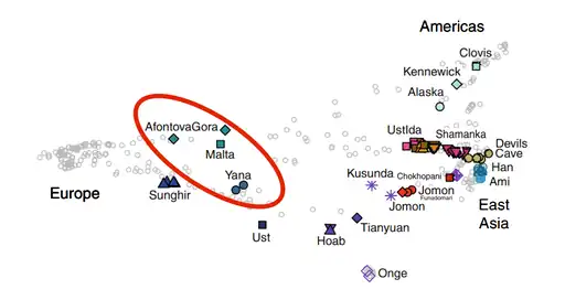 Genetic proximity of Mal'ta to other Ancient North Eurasian populations (Yana and Afontova Gora), but also to Ust-Ishim, Sunghir and European populations, within a principal component analysis of ancient and present-day individuals from worldwide populations.[32]