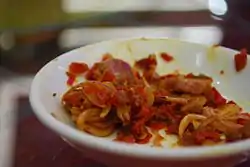 Traditional cooking methods in Malay cuisine are quite similar to life in Malay villages, slow and relaxed, as most Malay food is cooked on low heat for a long time compared to Chinese food.[10] There are numerous methods of cooking which consist of dry and moist methods.[11] Tumis (using a small amount of oil or fat in a shallow pan over relatively high heat), salai (food smoked or grilled with the ingredients often cut into pieces or thinly sliced to facilitate fast cooking), sangai (food, mainly dried spices, fried without oil), and layur (warmed over low heat to dry) are examples of terms for dry-heat cooking methods. On the other hand, moist-heat cooking methods includes terms such as tanak (cooking in a pot, especially rice), jerang (boiling or simmering), celur (blanching or dipping food such as vegetables into hot water) and reneh (simmering or boiling food).[12]