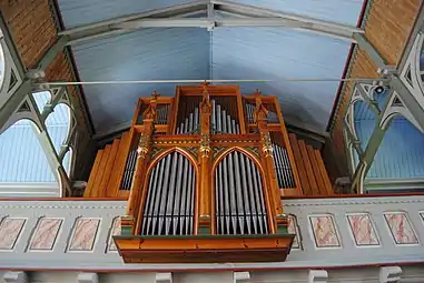 Again in 1822, the church caught fire by a lightning strike. This damaged the tower and part of the masonry structure, but the damage was not severe and it was quickly repaired. In 1885, the church was sold back to the municipality from private ownership. Immediately afterwards, the parish decided that the church was too small, and it needed to be enlarged. After some planning, it was determined that enlarging the old church would be more expensive than tearing it down and building a new wooden church. In 1891, the old church was torn down and replaced by a new wooden one. The architect Hans Heinrich Jess from Bergen was commissioned to make the architectural drawings and Karl Askeland was hired to lead the construction work. The new church was consecrated on 27 October 1891. In 1950-1957, the northern sacristy was replaced with an addition that included a church hall with a kitchen and hallway.[3][4]