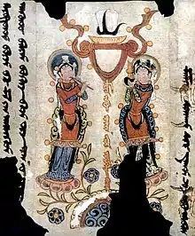 Manichaeans in Iran tried to assimilate their religion along with Islam in the Muslim caliphates.[70] Relatively little is known about the religion during the first century of Islamic rule. During the early caliphates, Manichaeism attracted many followers. It had a significant appeal among the Muslim society, especially among the elites. A part of Manichaeism that specifically appealed to the Sasanians was the names of the Manichaean gods. The names Mani had assigned to the gods of his religion show identification with those of the Zoroastrian pantheon, even though some divine beings he incorporates are non-Iranian. For example, Jesus, Adam or Eve were, respectively, given the names Xradesahr, Gehmurd or Murdiyanag. Because of these familiar names, Manichaeism did not feel completely foreign to the Zoroastrians.[71] Due to the appeal of its teachings, many Sasanians adopted the ideas of its theology and some even became dualists.