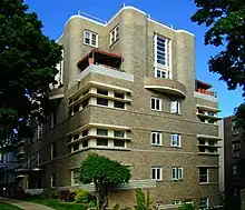 • The Beecroft house at 514 N Carroll St was designed by Claude & Starck and built in 1911, again with broad eaves and bands of windows, but with bold brick pilasters at the corners and a gable end that suggests a pediment.[25][2]