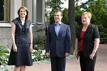 Mari Kiviniemi (left) with then-President of Russia Dmitry Medvedev and then-President of Finland Tarja Halonen (right)