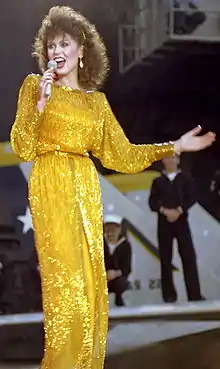 Olive Marie Osmond (born October 13, 1959) is an American singer, actress, television host and a member of the show business family the Osmonds. Although she was never an official member of her family's singing group, she gained success as a country and pop music artist and television variety show cohost in the 1970s and 1980s. Her best-known song is a remake of the country pop ballad "Paper Roses". From 1976 to 1979, she and her singer brother Donny Osmond hosted the television variety show Donny & Marie.