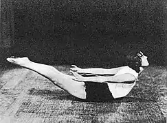 In the 1920s she again began to hold classes, initially for children in her own home, and by 1926 was training teachers in her own system at the Bagot Stack Health School in Holland Park, London. This initially involved 12 sequences of exercise designed to train the body in accordance with the seven principles of the Bagot Stack System.[6] There were classes for women and children in dance as well as exercises. Her inspiration for developing her own exercise system came from a short time in India, where she observed the differences in movement between women wearing constricting Europeans clothes and those with looser Indian clothing. She had also studied hatha yoga on her travels in India. She developed a series of exercises based around her belief that movement was essential in life. This also fitted with ideas developing across Europe at the time of the benefits to women of exercise and changes in clothing fashions.[7] As well as involving vigorous group exercises, the classes were designed to be sociable, which benefited the many recently bereaved women.