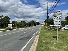 Maryland Route 222 Truck was a signed 12.49-mile (20.10 km) truck bypass of MD 222 from MD 222 in Perryville to US 1 and US 222 in Conowingo.[1] The signed route followed MD 275 from MD 222 in Perryville north to MD 276 in Woodlawn. MD 222 Truck continued north on MD 276 from Woodlawn north to US 1 west of Rising Sun. The truck route then headed west on US 1 (in a wrong-way concurrency) to US 222's southern terminus in Conowingo.[1][31] MD 222 Truck was first signed by 2002.[32] Signs for MD 222 Truck were removed by 2016 and replaced with signs directing trucks to I-95 and US 40 southbound and to US 222 northbound.[31]