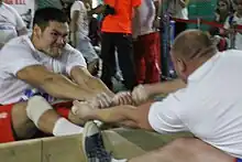Mas-wrestling (Russian: Мас-рестлинг) is the international name used for the Yakut ethnosport derived from the traditional stick pulling game mas tard'yhyy (мас тардыhыы, 'stick tugging'). Reminiscent of the Eskimo Stick Pull featured at the World Eskimo Indian Olympics, Norwegian kjevletrekk, Finnish kartunveto or väkikapulan veto, as well as the Highland test of strength The Swingle Tree (played with a shepherd's crook), participants taking part in mas-wrestling competitions sit in front of each other, prop their feet against the board that divides the competition area and tug on a wooden stick (mas), making sure to keep it parallel to the propping board. Mas-wrestling demands great muscular strength from the hands, legs, back, and abdominals.