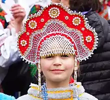 A girl wearing a traditional Russian kokoshnik hat for Maslenitsa in Slovenia.