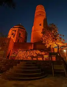 The minaret of Ali Abuzar is the most conspicuous structure of Sukkur town, dating back to 1607 during the Mughal Empire in the Indian subcontinent. Masum Shah was the governor of Mughal Emperor Akbar who appointed him as the Nawab of Sukkur. The minaret was built in about 1607 the monument, built of red brick, is more or less conical in shape, slightly off the perpendicular and surmounted by a dome to which an internal stone staircase gives an access. It is about 26 metres in circumference and has 84 steps to the top. It is about 31 metres feet in height and can be seen from miles away. This minaret is believed to have been used as a watch tower. The courtyard around the minaret is the cemetery where Mir Mausum Shah and his family members are buried.