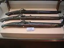 - ↑ The definition of firelock changes over times, in later era it could refer to flintlock and wheellock. According to Merriam-Webster, a firelock is "a gun's lock employing a slow match to ignite the powder charge", first recorded in 1544. See Merriam-Webster. (n.d.). Firelock. In Merriam-Webster.com dictionary. Retrieved October 13, 2022.