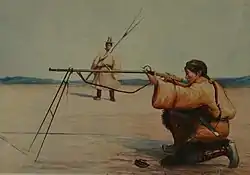 Tibetans have used matchlocks from as early as the sixteenth century until very recently.[22] The early 20th century explorer Sven Hedin also encountered Tibetan tribesmen on horseback armed with matchlock rifles along the Tibetan border with Xinjiang. Tibetan nomad fighters used arquebuses for warfare during the Chinese invasion of Tibet as late as the second half of the 20th century—and Tibetan nomads reportedly still use matchlock rifles to hunt wolves and other predatory animals.[23] These matchlock arquebuses typically feature a long, sharpened retractable forked stand.