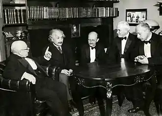 From left to right: W. Nernst, A. Einstein, Planck, R. A. Millikan, and von Laue at a dinner given by von Laue in Berlin on 11 November 1931