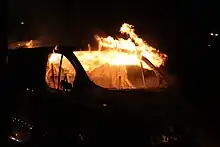 There was a smaller disturbance in southern Stockholm, but it is not known whether it was related to Husby. The trouble also spread to Fittja, Kista, Rinkeby, and Tensta.[7] On the night of Tuesday 21 May, the disturbances spread to Bredäng, Edsberg, Flemingsberg, Norsborg and Skarpnäck. Thirty cars were set on fire, and the Jakobsberg police station and shopping center were vandalized. Eight people were arrested. Calm had returned by 3 am.[16] The disturbances continued on 22 May when a large number of cars were set on fire. In Rinkeby 7 cars were burned.[17] In Rågsved, a police station was burned down. In Hagsätra, the police were attacked at 10 pm, and one police officer was injured. In Skogås, a restaurant was burned down and firefighters were attacked with stones.[18] On Thursday, 23 May, at about 8 pm (CET) police were called to Rinkeby to a spot where five cars had been set on fire.[19] Youths also threw rocks and glass bottles at a Metro station in Vällingby, breaking windows on several Metro trains and threatening staff at the station before leaving the scene.[19][20] After midnight, several small fires were reported in Tensta and Farsta.[19] At least two schools, a police station and 15 cars were set ablaze. Thirteen people were arrested that night and the following morning.[21]