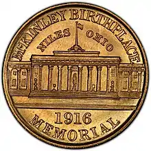 The reverse, designed by Morgan, is intended to be a facing view of the McKinley birthplace memorial in Niles, but according to Swiatek and Breen, "the most charitable view must characterize it as inaccurate and incompetently done".[19] Above the building is "McKinley Birthplace/Niles Ohio", and beneath it the date and "Memorial".[25]
