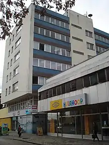 During the late socialist period in the former federal state, MTČ was organized[9] as a "labour organization" (RO) that included several so called "basic organizations of associated work" (OOUR).[10] The information published in the media in that period about the physical volume of production in MTČ said that there were more than 10 million knitted products, 11 million pairs of socks and more than 100 million meters of MTČ's haberdashery products on the market.[11] In its OOURs, the company had plants for the production of raw and finished knitted material (including dyeing) and its storage, as well as modelling workshop (where samples and models of finished products were made), a tailoring department, a sewing unit, a packaging section and a warehouse of finished goods. There were also separate factories for the production of socks, stockings and haberdashery, as well as units for technical and auxiliary work, including maintenance of machines, transport and workers' restaurant.