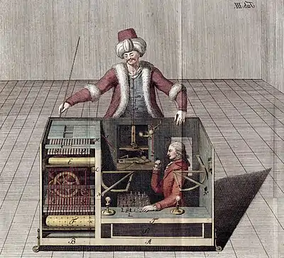 The Mechanical Turk, also known as the Automaton Chess Player (German: Schachtürke, lit. 'chess Turk'; Hungarian: A Török), or simply The Turk, was a fraudulent chess-playing machine constructed in 1770, which appeared to be able to play a strong game of chess against a human opponent. For 84 years, it was exhibited on tours by various owners as an automaton. The machine survived and continued giving occasional exhibitions until 1854, when a fire swept through the museum where it was kept, destroying the machine. Afterwards, articles were published by a son of the machine's owner revealing its secrets to the public: that it was an elaborate hoax, suspected by some, but never proven in public while it still existed.[2]