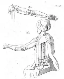 The interior also contained a pegboard chess board connected to a pantograph-style series of levers that controlled the model's left arm. The metal pointer on the pantograph moved over the interior chessboard, and would simultaneously move the arm of the Turk over the chessboard on the cabinet. The range of motion allowed the operator to move the Turk's arm up and down, and turning the lever would open and close the Turk's hand, allowing it to grasp the pieces on the board. All of this was made visible to the operator by using a simple candle, which had a ventilation system through the model.[15] Other parts of the machinery allowed for a clockwork-type sound to be played when the Turk made a move, further adding to the machinery illusion, and for the Turk to make various facial expressions.[16] A voice box was added following the Turk's acquisition by Mälzel, allowing the machine to say "Échec!" (French for "check") during matches.[4]