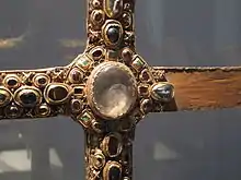 In early medieval jewelled objects, gems were often set profusely spaced across surfaces, here a cross