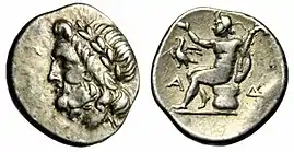 A silver triobol of the Arcadian League from ancient Megalopolis. The head of Zeus on the obverse, Pan seated on the reverse.
