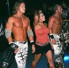 While managing the Tag Team Champions, Melina's character was developed to be more egotistical, as she declared herself "the most-dominant Diva in WWE".[4] She made her official in-ring debut on June 30 against Michelle McCool, and had her first pay-per-view match against Torrie Wilson at The Great American Bash in a bra and panties match, winning both matches.[29][30] In the same night, MNM dropped their championships to the Legion of Doom, prompting a new storyline where Melina hired Jillian Hall, a fixer, to assist them.[30][31] MNM regained the titles on October 28 in a fatal four-Way tag team match.[32] On the Eddie Guerrero Tribute Show, Melina won a Divas battle royal by eliminating the Women's Champion Trish Stratus.[33] The next week, as a part of a new storyline, MNM kidnapped Stratus, tied her up and gagged her for Melina, who then challenged her to a match for the Women's Championship.[34] The two fought at Survivor Series, with Melina losing to Stratus with the help of Mickie James.[35]