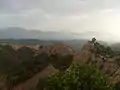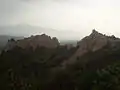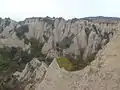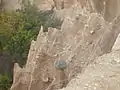 The area around Melnik is strikingly eroded, particularly the enormous area of cliff that serves as a backdrop to the town. This area, covering some 17 km² near Melnik, Kurlanovo and Rozhen, has been called the Melnik Earth Pyramids or Melnik Badlands. The hills in this area can rise up to 100 metres (330 ft) high.[7] The unique formations, which can resemble giant mushrooms, ancient towers, and obelisks, were formed when heavy rain eroded the sand and clay the hills are composed of.[7]